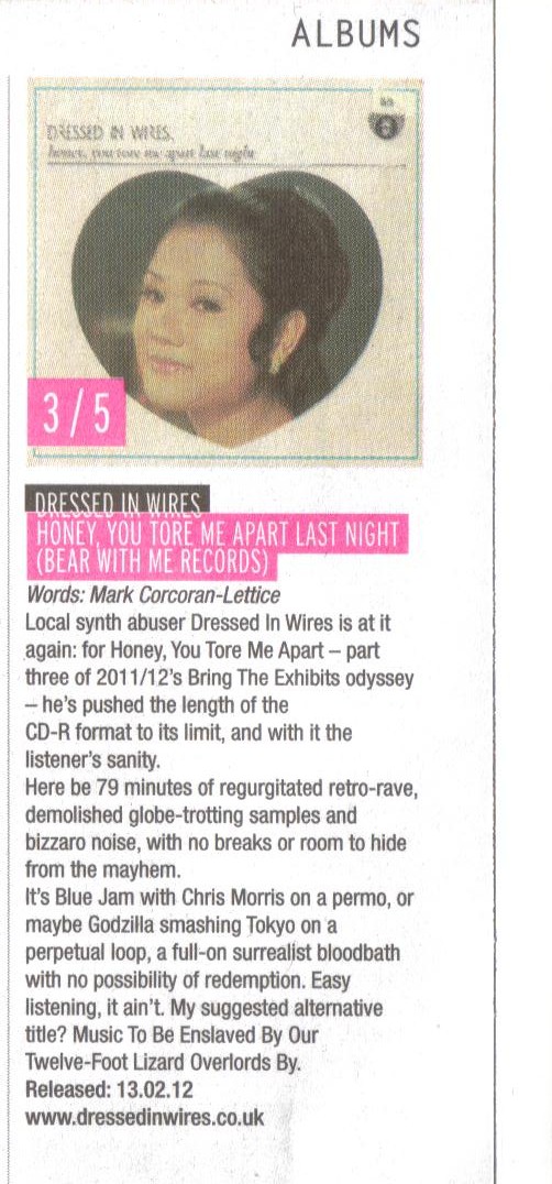 "Godzilla smashing Tokyo on a perpetual loop, a full-on surrealist bloodbath with no possibility of redemption.... easy listening it ain't." NARC magazine Feb 2012