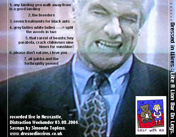 Cock me! It's a FREE DiW album for your download pleasure. "Like A Lion Bar On Legs" is a live recording taken from the August 2004 Distraction Weekender. It's action all the way. Download the mp3s below, burn the CD, and print oot the covers. Go on.
